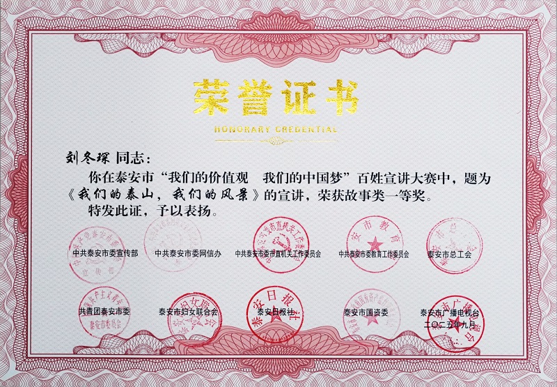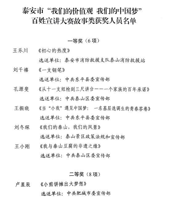 近日,中共泰安市委宣傳部等多部門(mén)聯(lián)合主辦的泰安市“我們的價(jià)值觀我們的中國(guó)夢(mèng)”百姓宣講大賽結(jié)果公布,泰山文旅集團(tuán)子公司泰山出品公司職工劉冬琛,憑借題為《我們的泰山,我們的風(fēng)景》的宣講,榮獲故事類(lèi)一等獎(jiǎng)。
